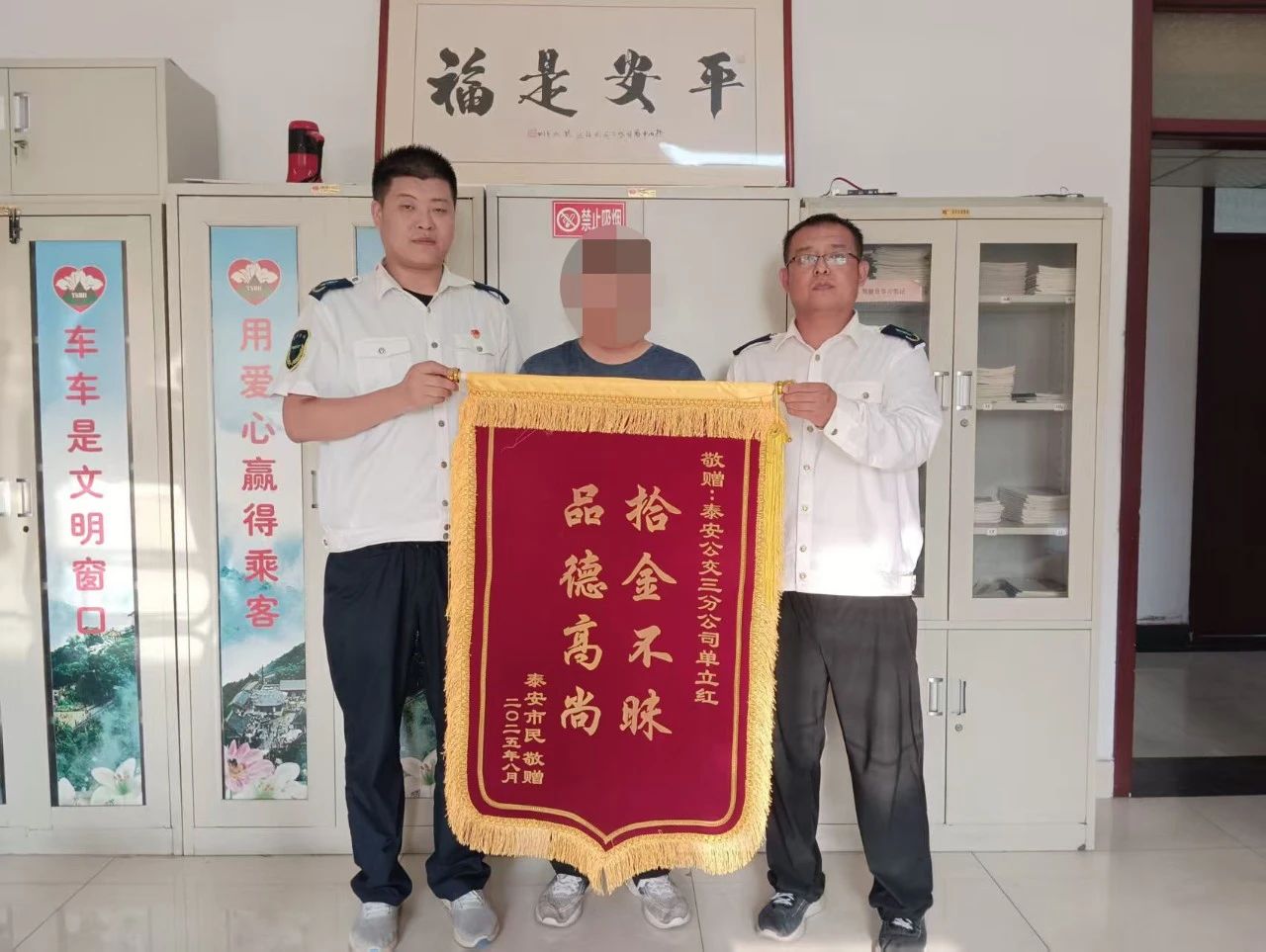8月15日,泰城市民李女士的家人將一面寫有“拾金不昧 品德高尚”的錦旗送到泰安公交第三分公司,向7路公交駕駛員單立紅表達(dá)誠摯感謝,感謝其撿到李女士遺失的手機(jī)后妥善保管并歸還。
