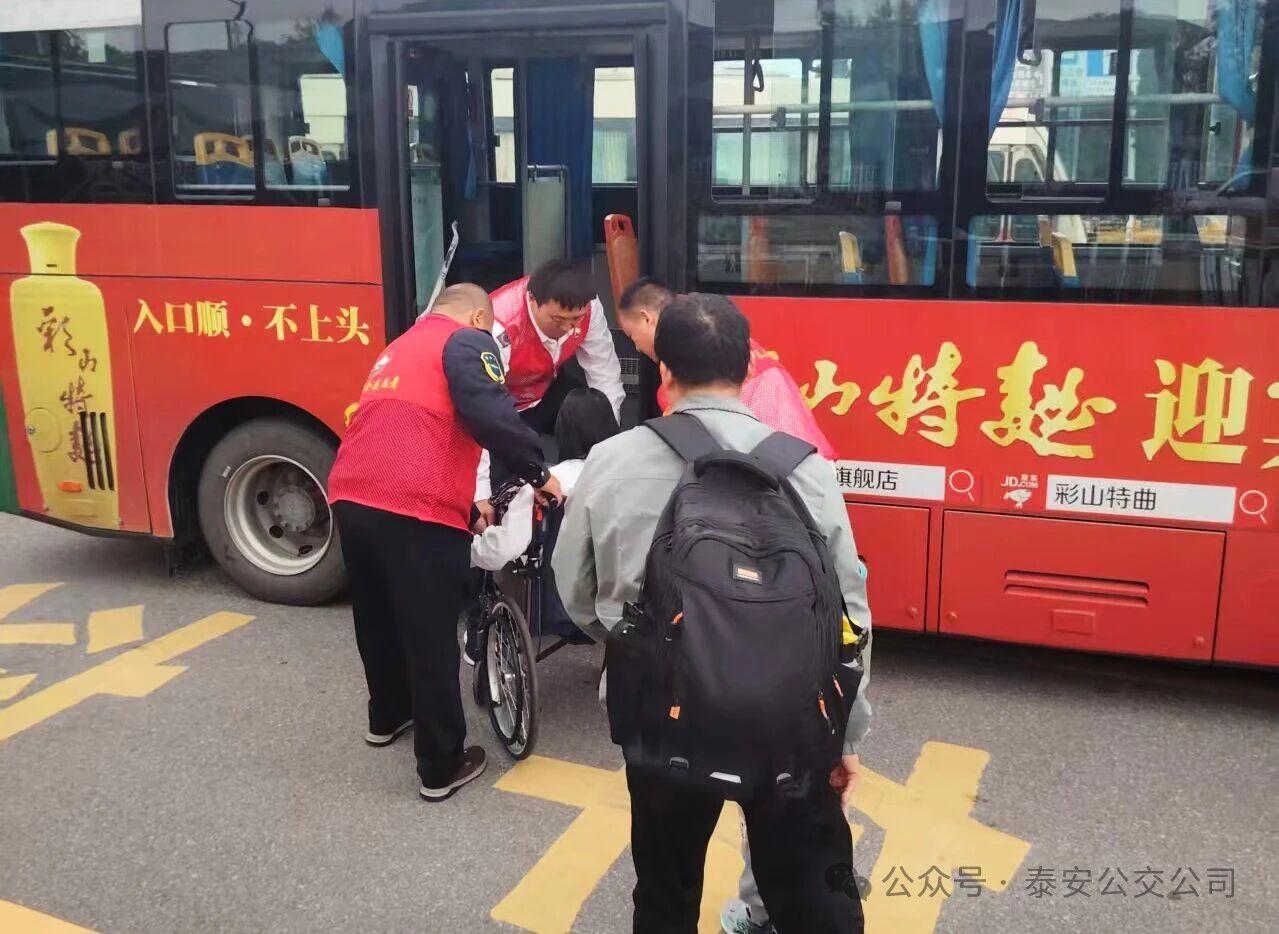同日,天外村公交樞紐站同樣游客如織。第五分公司公交志愿者趙峰、唐圣春、李磊、劉一鳴正在現(xiàn)場維持乘車秩序,這時(shí),他們發(fā)現(xiàn)不遠(yuǎn)處有位腿腳不便的男士,正牽著孩子、推著輪椅上的愛人,朝著旅游專線乘車處趕來。趙峰立刻主動走上前詢問需求,得知這是一家三口來泰山旅游,下山后需要乘車前往紅門。